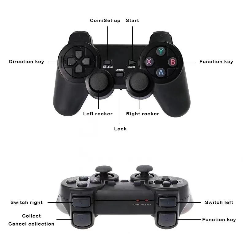 Compatible con 25 idiomas. La última consola de juegos de TV inalámbrica, con tarjeta de memoria de 64G/32G, más de 10000/3500 juegos integrados, se pueden buscar, coleccionables, archivables y le permite descargar sus juegos favoritos;