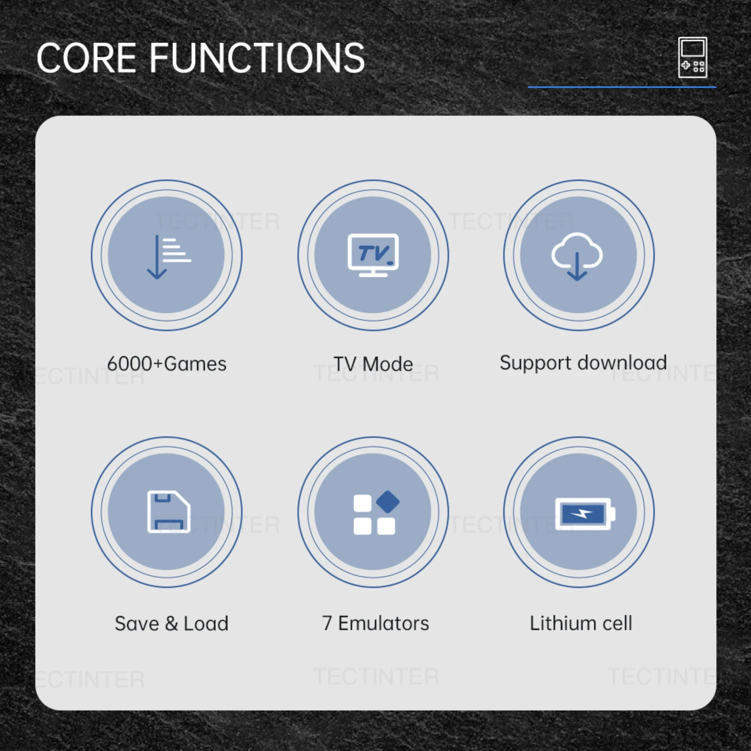 Esta consola de juegos portátil es compatible con GB/GBA/GBC/FC/SFC//PCE que cubre muchos tipos de juegos, como aventuras, acción, carreras, etc.Más de 6000 juegos están preinstalados. Los jugadores pueden seguir los tutoriales en vídeo proporcionados y jugar los juegos por sí mismos.